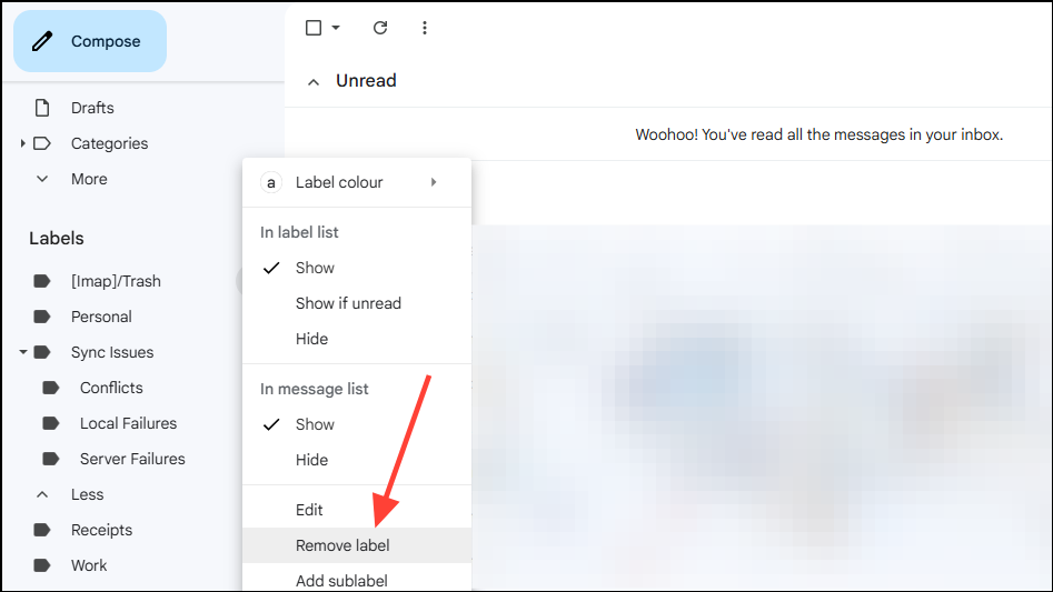 - Now click on the 'Remove label' option to remove it. Deleting a label will not delete your emails.