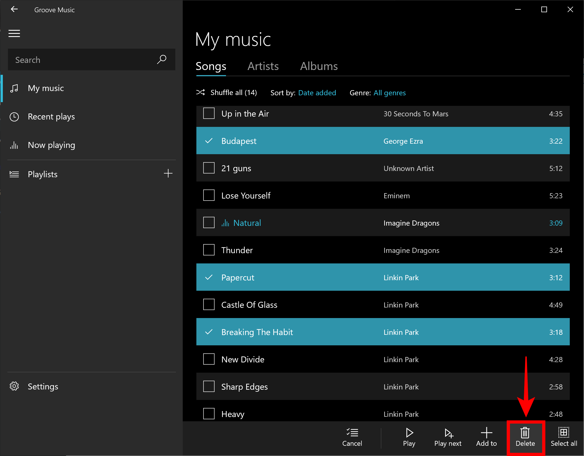 This can get quite tedious after a while, especially if you have hundreds or thousands of songs. To make it a little faster, you can delete multiple songs together. Select the ones you want to delete by checking the square boxes on the left of a song title. Then, delete them together by clicking the ‘Delete’ button at the bottom right of the window. Once you delete a song using Groove, the song gets deleted from the music folder on your PC as well.