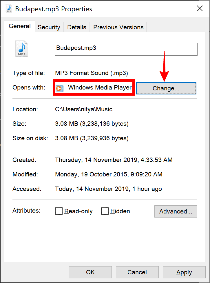 To check your default player or change it, select a song from your music folder and right-click on it. Select ‘Properties’ on the bottom of the list. Here, you can see which application is used to open MP3 files on your PC. Change it to Windows Media Player if it isn’t already set.
