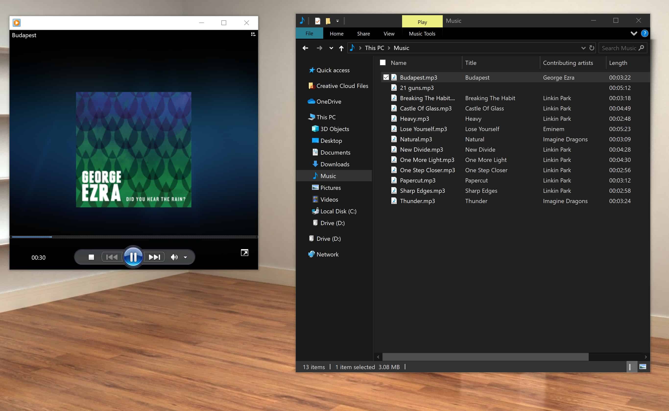 Now, you can start sorting through your music. Double-click or press Enter on your keyboard to play a song. This should open a small window of WMP. Rearrange your screen such that you can see both, the music folder as well as the WMP side by side. This is so that none of them are hidden from view while switching back and forth. It should look something like this.