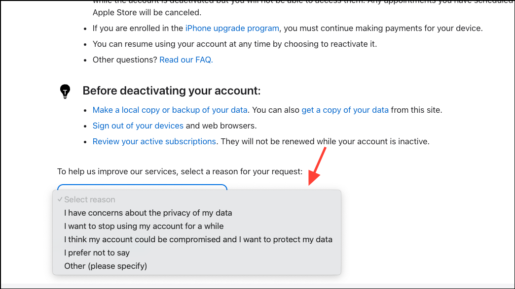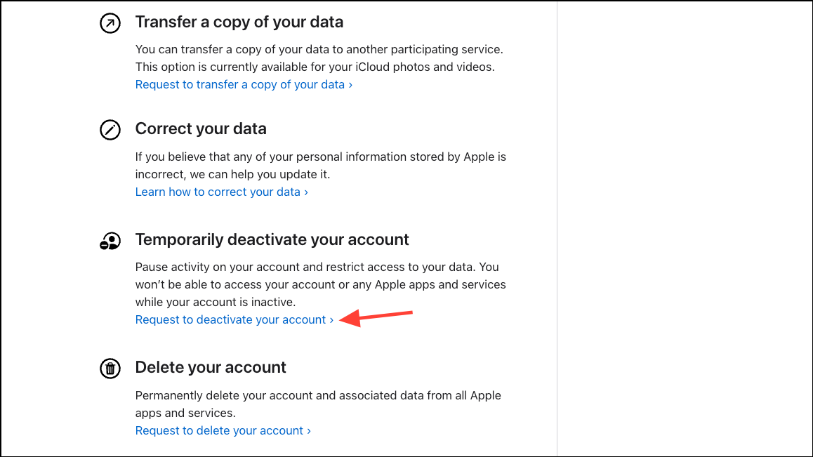 - Depending on your requirements, you can choose to deactivate or delete your Apple account by going to Apple's Data and Privacy website.