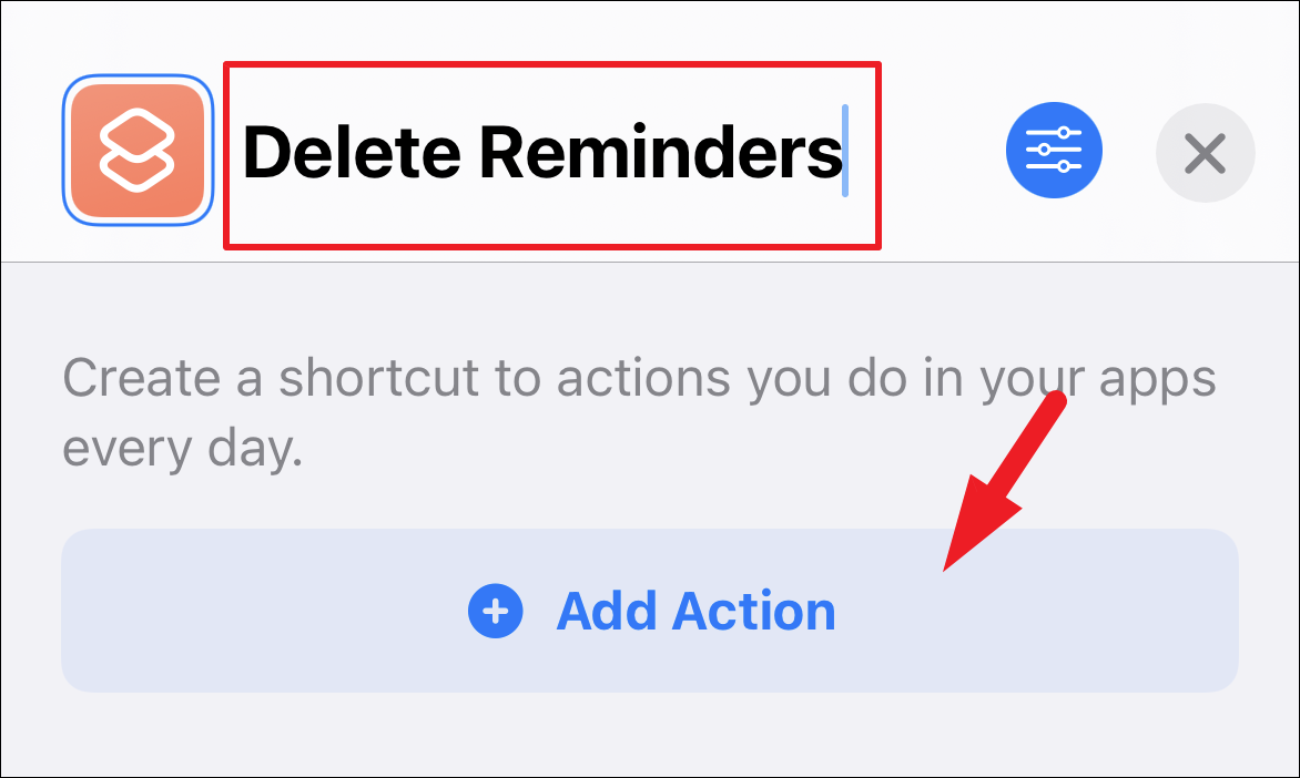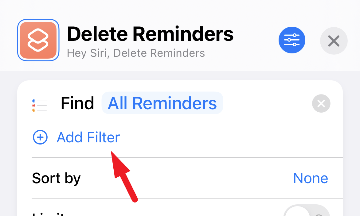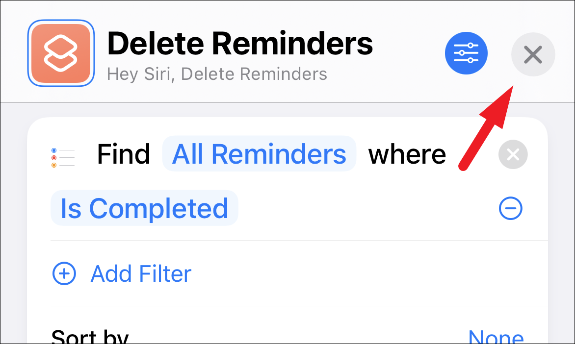 Once you have added the ‘Remove Reminders’ action to the shortcut, tap on the ‘X’ button to close the shortcut window.
