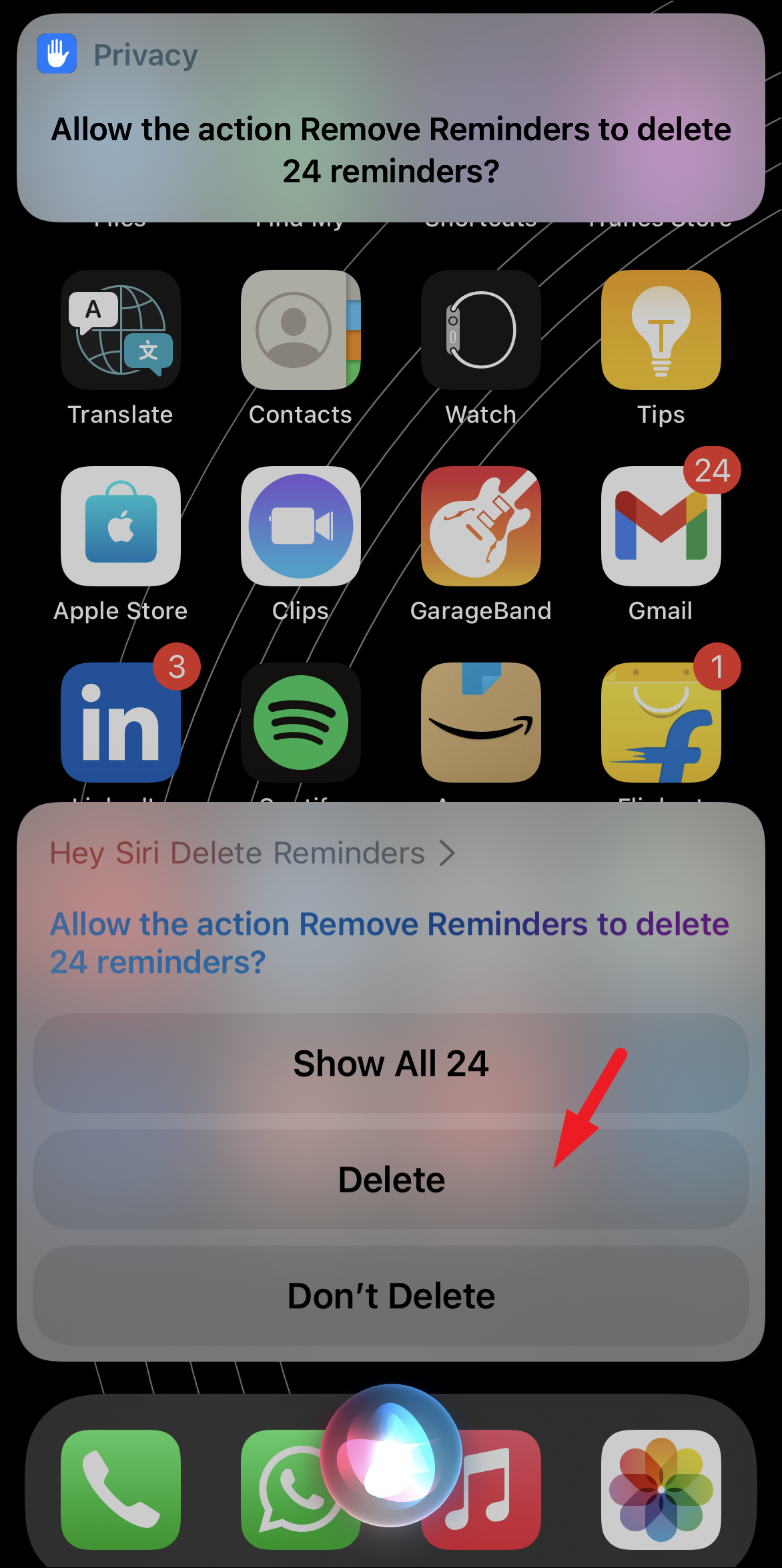 Finally, you will receive an overlay pane asking for your permission to delete all the reminders. To delete all of them at once, tap on the ‘Delete’ button.