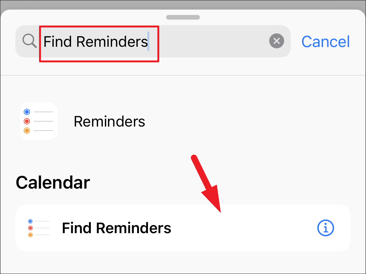 Next, tap on the search bar and type Find Reminders to search for the action. After that, from the search results, tap on the ‘Find Reminders’ tile present under the ‘Calendar’ section.