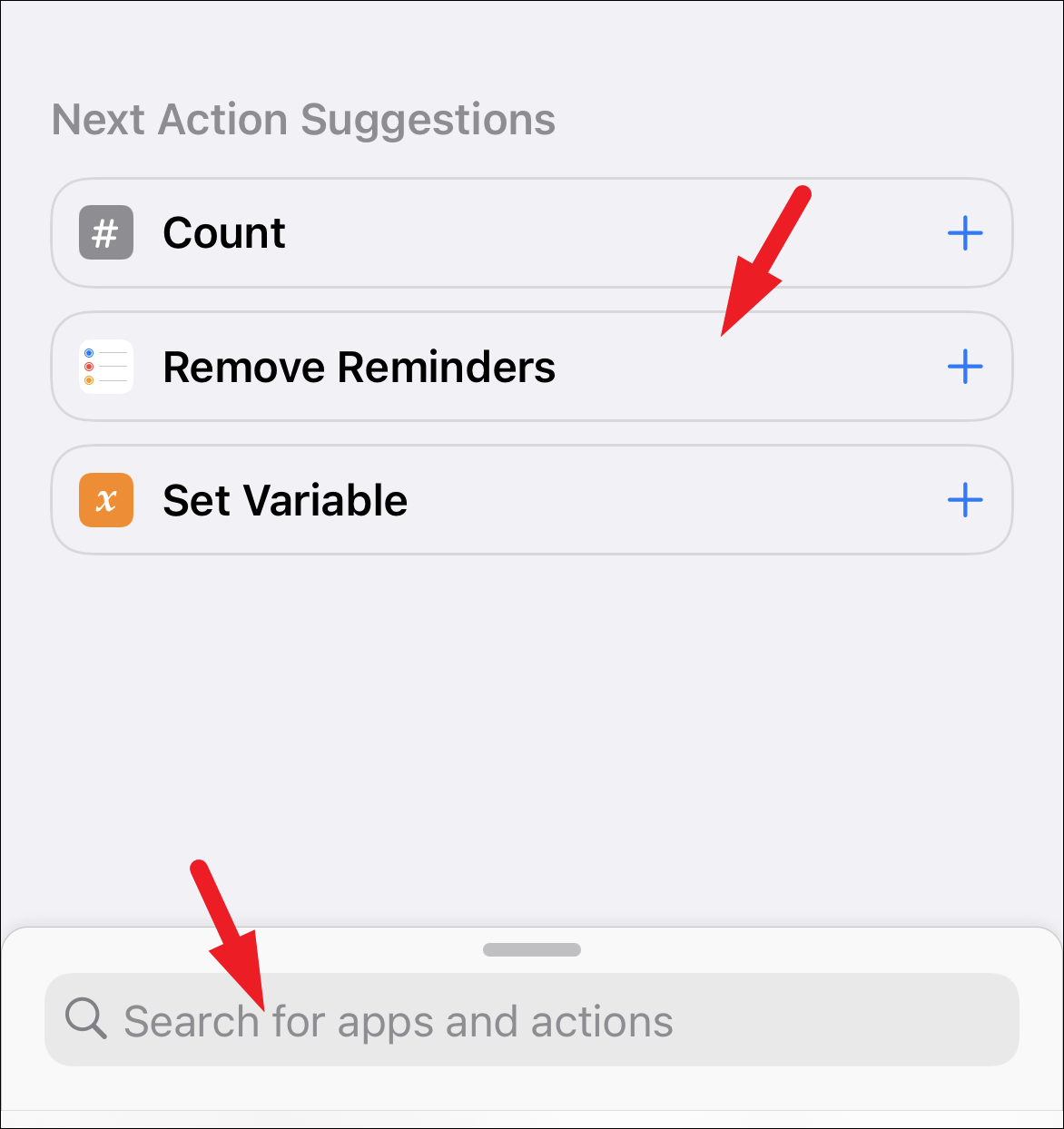 After that, tap on the ‘Remove Reminders’ tile present under the ‘Next Action Suggestion’ section. In case you do not have the action in the suggested section, tap on the search bar and type Remove Reminders to search for the action.