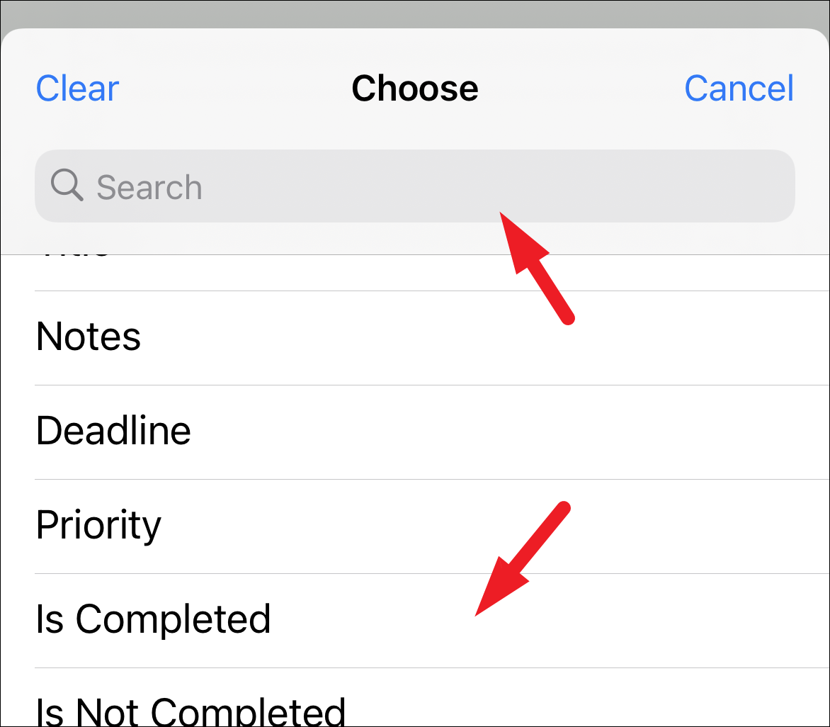 Then, either scroll down the list manually or perform a search using the search bar. to locate the ‘Is Completed’ option. Once located, tap on it to select and proceed.