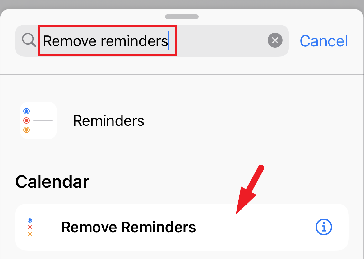 Then, from the search results, locate the ‘Remove Reminders’ tile present under the ‘Calendar’ section and tap on it to add as an action to the shortcut.