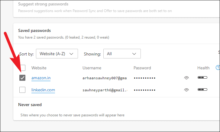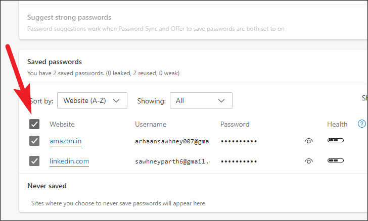 Scroll to the ‘Saved passwords’ section on the ‘Passwords’ page. Select all saved passwords by ticking the checkbox preceding the ‘Website’ option.