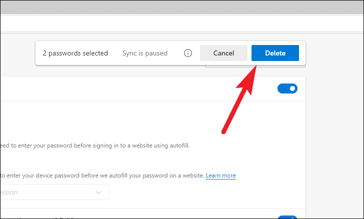 Click the ‘Delete’ button at the top of the page, after selecting the websites for which you wish to remove the saved password.