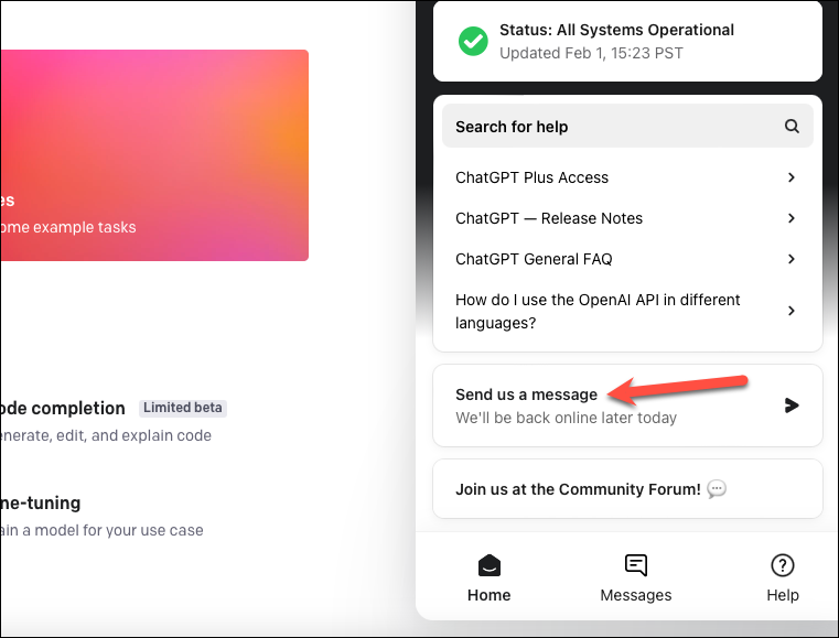 OpenAI’s Help panel will open in the bottom-right corner. Click the ‘Send Us a Message’ option.