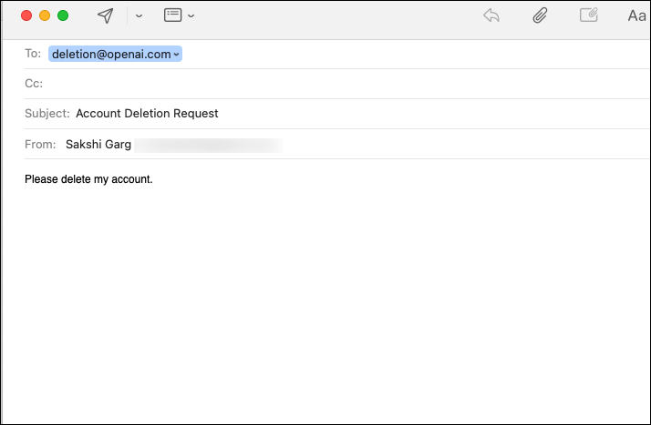 Send an email to deletion@openai.com from the account that you want to delete. The subject for the email should be “Account Deletion Request” and in the body of the email, add “Please delete my account“.
