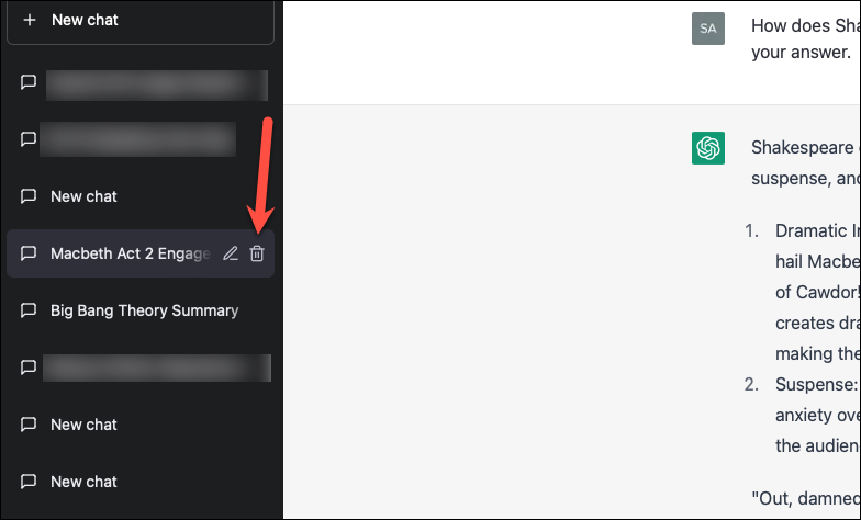 Instead of deleting your entire account, you can also delete your ChatGPT conversations. ChatGPT keeps a record of all your conversations with the chatbot in your account and you can view them again or continue them whenever you want. Additionally, you can delete any conversation if you want to. But you cannot delete individual prompts from a conversation.