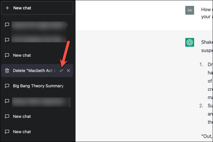 Confirm that you want to delete the chat by clicking the ‘check’ icon.
