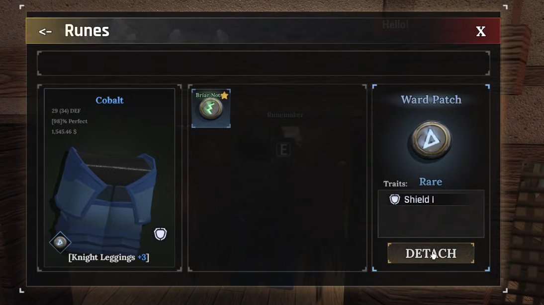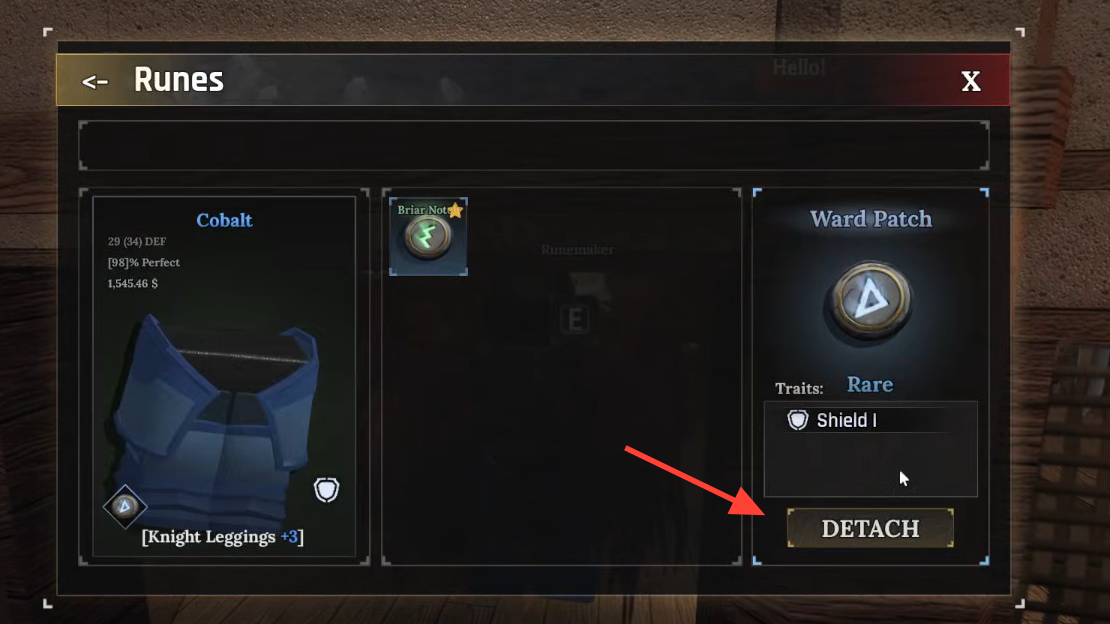 Step 4: After confirming, the rune disappears from the gear’s slot and is sent back to your rune stash, ready to be attached to another weapon, armor piece, or pickaxe later.