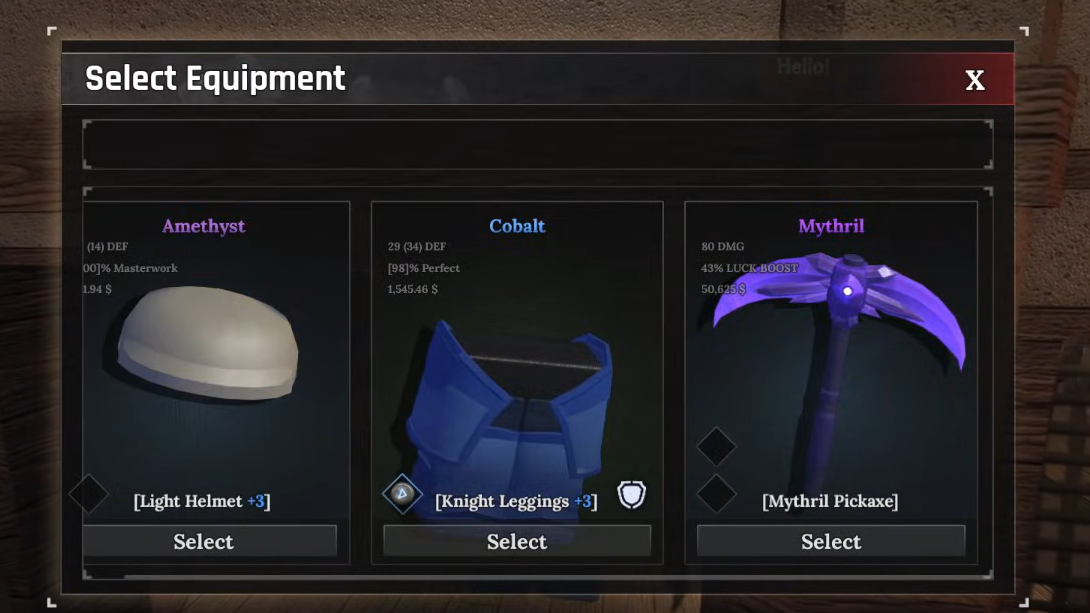 Step 3: In the Select Equipment panel, click the weapon, armor piece, or pickaxe that currently holds the rune you want to remove, then hit Select.
