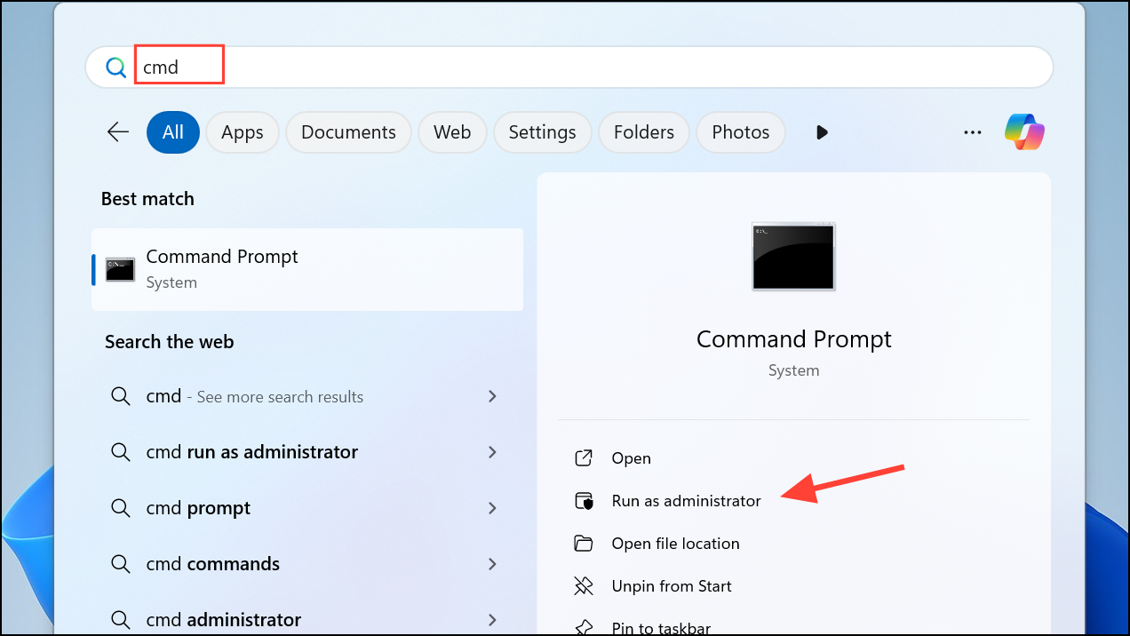 Step 1: Open Command Prompt as an administrator by clicking the Start button, typing cmd, then right-clicking Command Prompt and selecting Run as administrator.