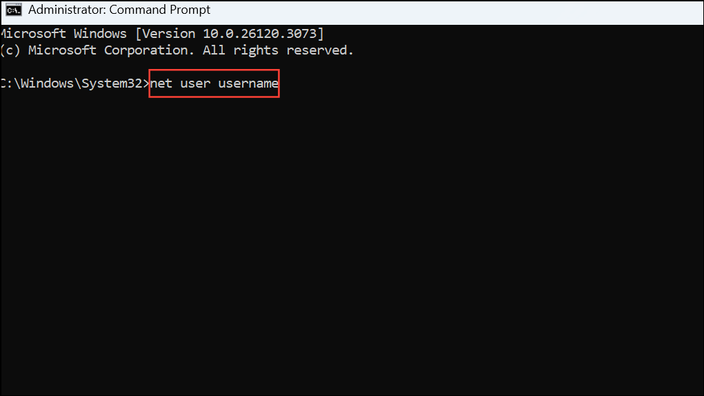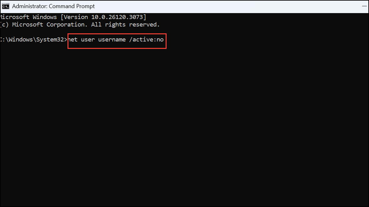 Step 2: In the Command Prompt window, type the following command to disable the user account, replacing username with the actual username you wish to disable: