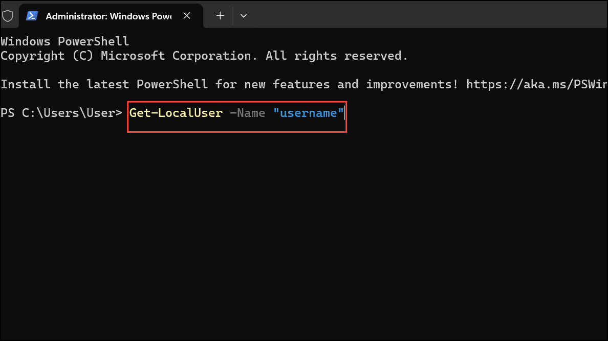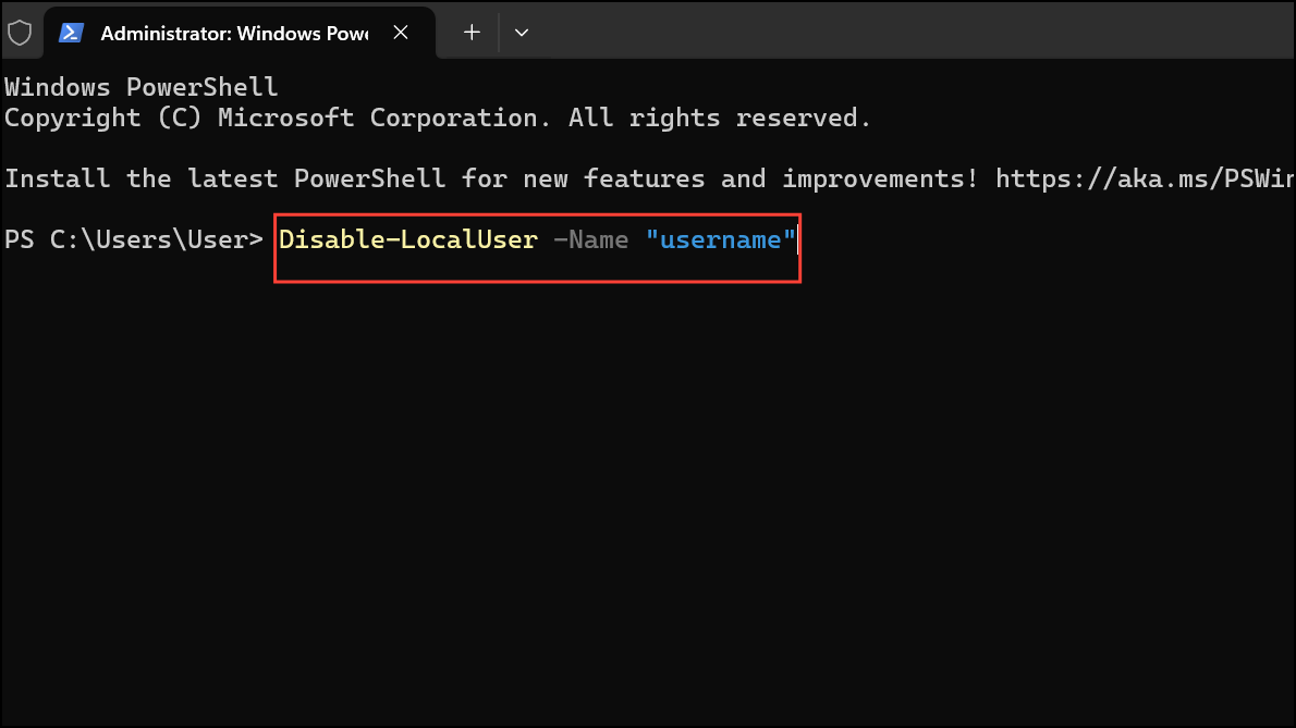 Step 2: In the PowerShell window, enter the following command, replacing username with the name of the account you wish to disable: