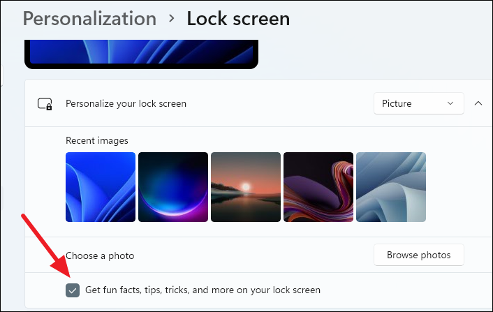 Step 3: If 'Picture' or 'Slideshow' is selected under 'Personalize your lock screen', scroll down and uncheck 'Get fun facts, tips, tricks, and more on your lock screen'.