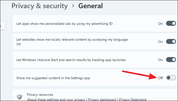 Step 3: Turn off the toggle for 'Show me suggested content in the Settings app'.