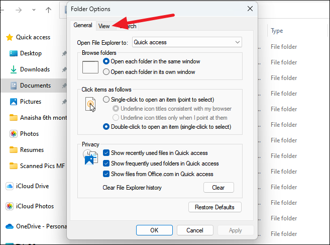 Step 4: In the Folder Options dialog box that appears, switch to the 'View' tab.