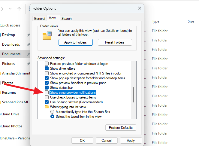 Step 5: Scroll through the Advanced settings list, uncheck the option labeled 'Show sync provider notifications', then click 'Apply' and 'OK' to save the changes.
