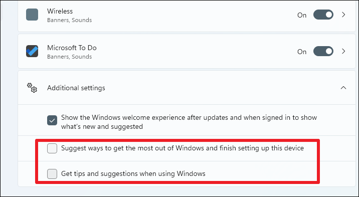 Step 5: Uncheck 'Get tips and suggestions when using Windows' and 'Suggest ways to get the most out of Windows and finish setting up this device' to prevent additional notifications.