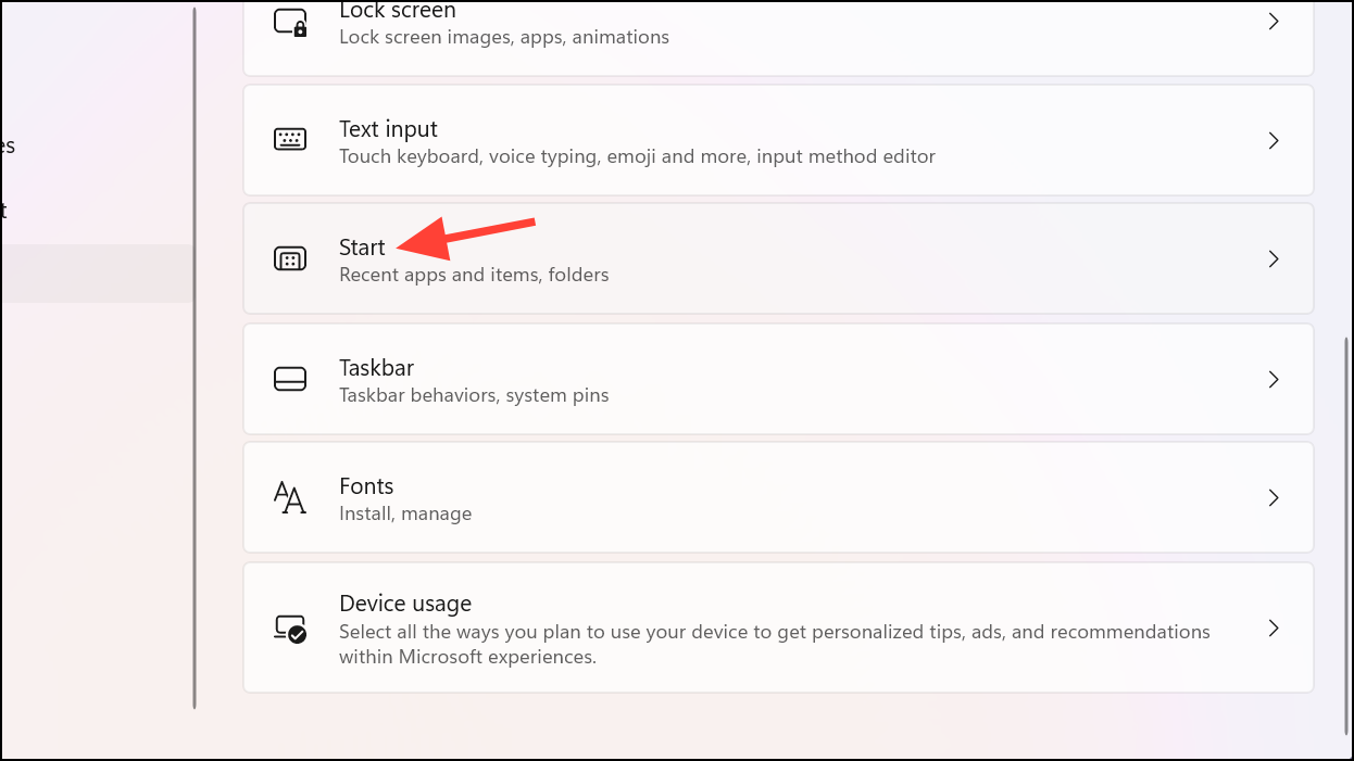 Step 3: On the right pane, scroll down and click on Start to modify the Start Menu settings.