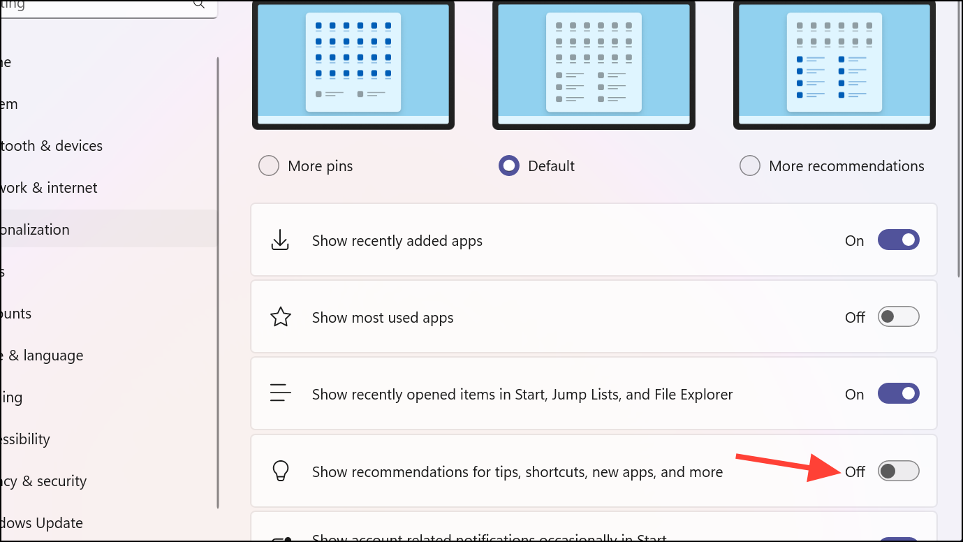 Step 4: In the Start settings, find the option labeled Show recommendations for tips, shortcuts, new apps, and more and toggle it off.