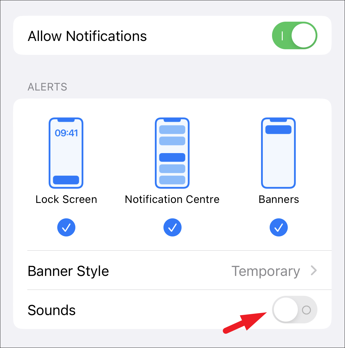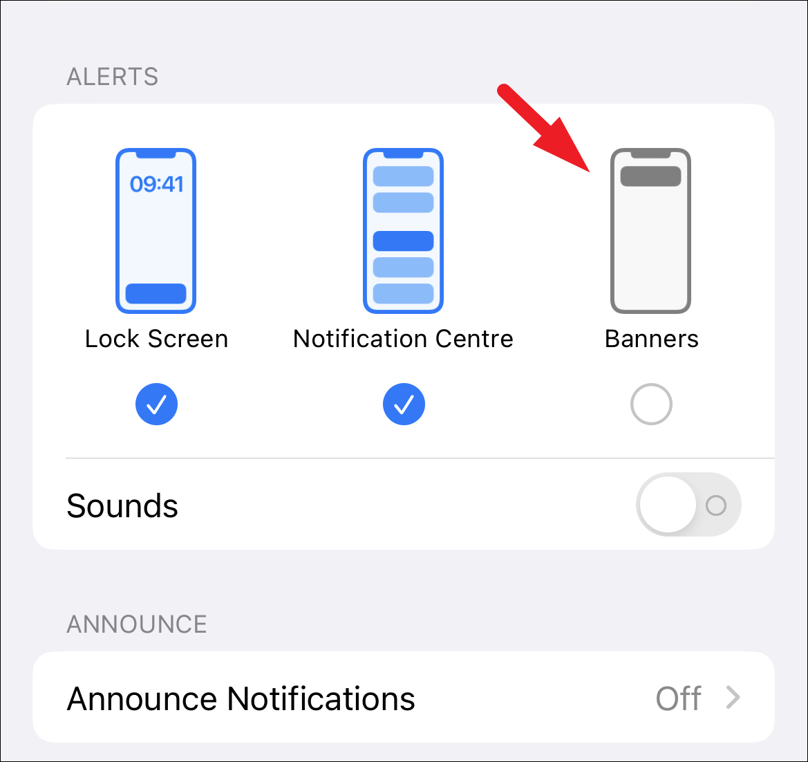 If you wish to keep the notifications only in the notifications center and do not wish to receive a banner as well, tap on the ‘Banners’ wireframe displayed on the screen to unselect it. If you have also turned off Sounds, the notification will arrive silently and will stay in the notification center. Do note you will still be able to see it on the lock screen.