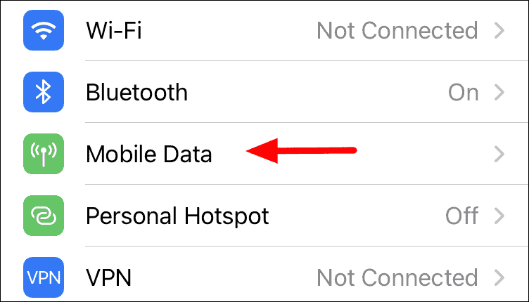 When you open ‘Settings’, the first couple of options are all network-related. Since we want to disable data access for apps, tap on ‘Mobile Data’.