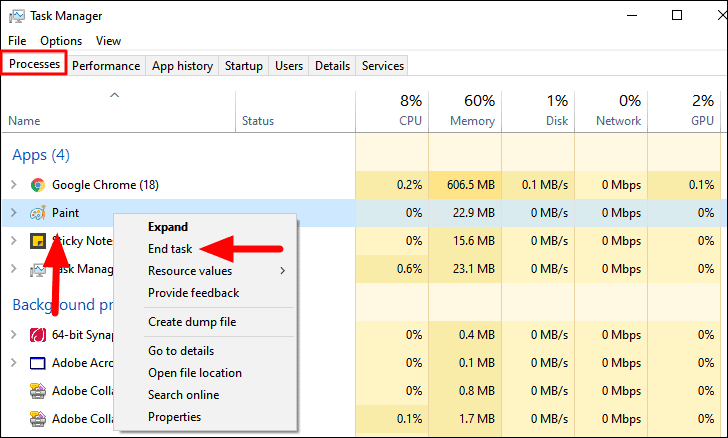 The ‘Processes’ tab open launches by default in the ‘Task Manager’ screen. Next, locate the ‘Paint’ option under apps, right-click on it, and then select ‘End task’ from the context menu.