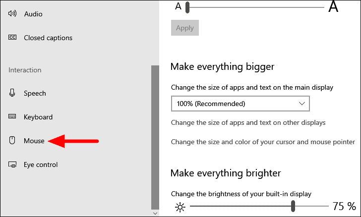 You will now find various tabs listed on the left. Scroll down to the bottom and select the ‘Mouse’ option under ‘Interaction’.