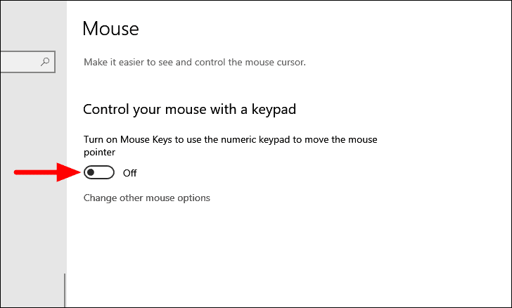 In the ‘Mouse’ settings, verify if the ‘Mouse Keys’ feature is disabled. In case it’s turned on, click on the toggle to disable it.