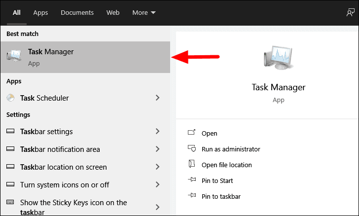 To end the MS Paint process, search for ‘Task Manager’ in the ‘Start Menu’ and then click on the search result to launch the app.