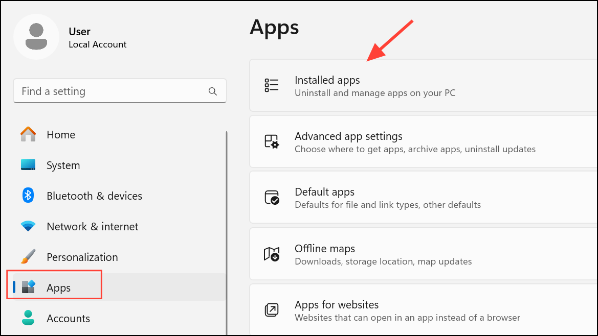 Step 2: In the left-hand menu, select Apps, then click on Installed Apps. This section lists all installed applications on your device.