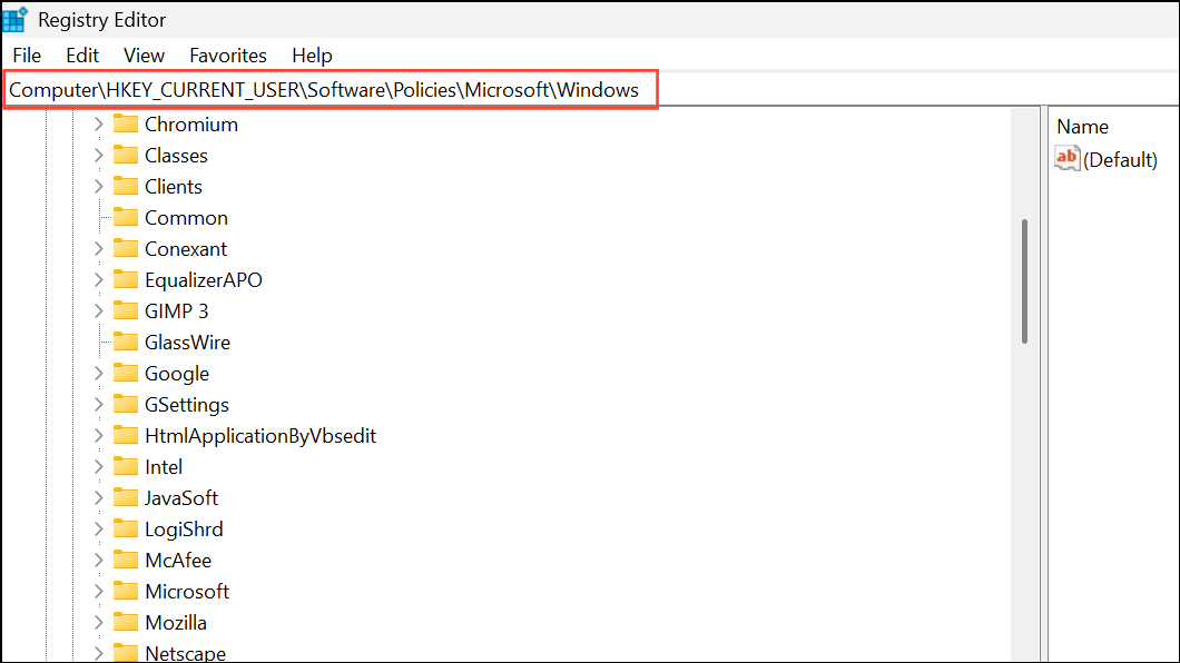 HKEY_CURRENT_USER\Software\Policies\Microsoft\Windows