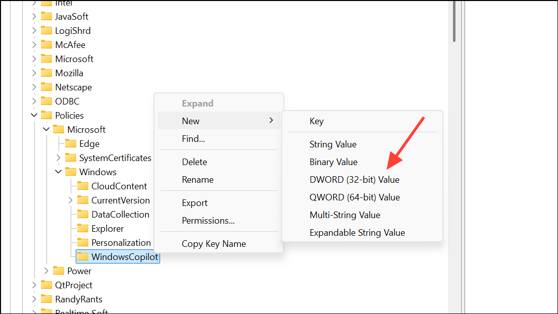 Step 4: Select the new WindowsCopilot key. Right-click in the right pane, choose New > DWORD (32-bit) Value, and name it TurnOffWindowsCopilot.