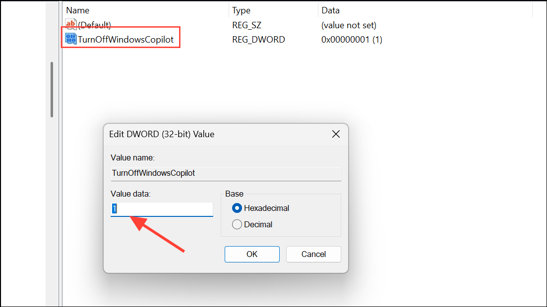 Step 5: Double-click the new value and set its data to 1. This disables Copilot features for your user account.