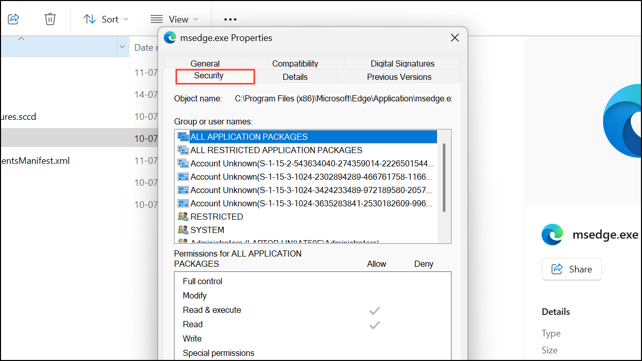 Step 2: Right-click msedge.exe, select Properties, go to the Security tab, and adjust permissions to remove all access. This prevents Copilot from launching Edge, but will also impact your ability to use Microsoft Edge normally.