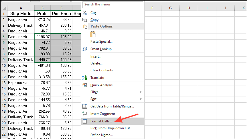 - Once you've selected the cells you want, right-click on the selection and then click on 'Format cells'.