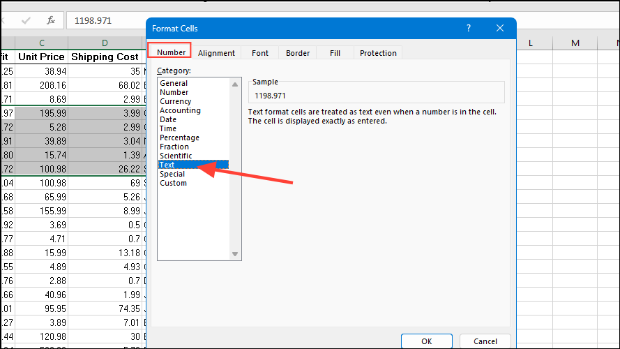 - When the 'Format cells' dialog box opens, click on the 'Text' option under the 'Number' tab and then on the 'OK' button.