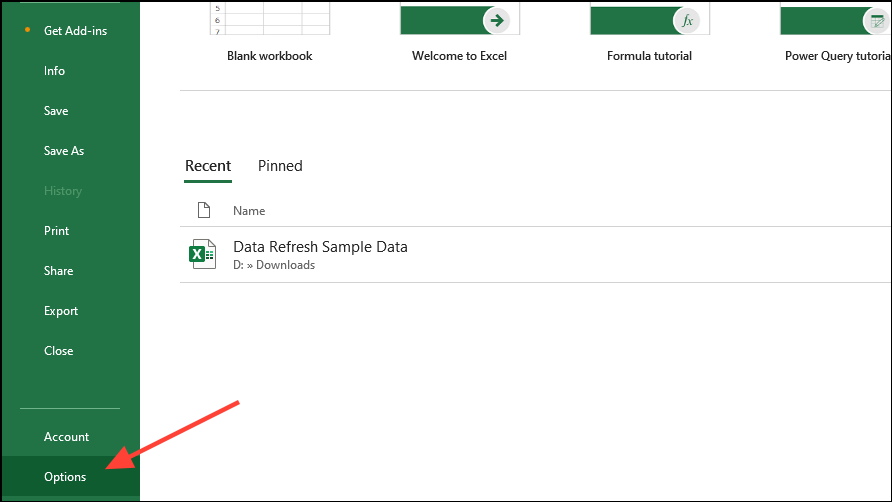 - Next, click on 'Data' on the left in the Options dialog box.