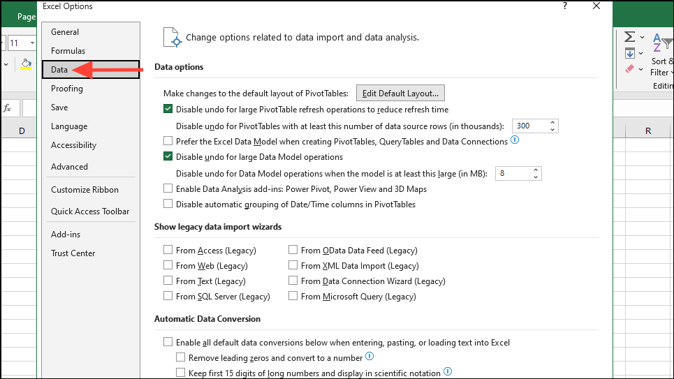 - In the 'Automatic Data Conversion' section, check that the checkbox next to the 'Enable all default data conversions below when entering, pasting, or loading text into Excel' is unchecked. If it is enabled, click on it to disable it.