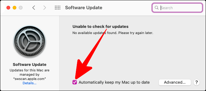 In the ‘Software Update’ window, uncheck the tiny box next to the ‘Always keep my Mac up to date’ option.