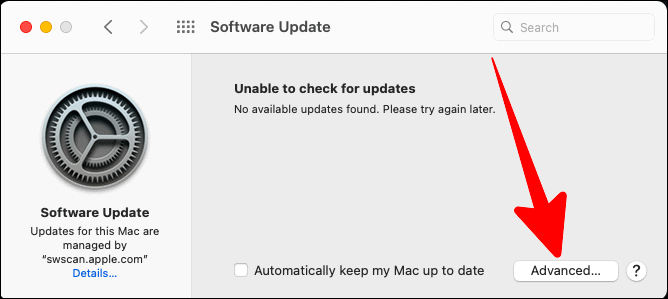 If you want to disable your Mac from even downloading any available software updates automatically, click on the ‘Advanced’ button in the ‘Software Update’ window.