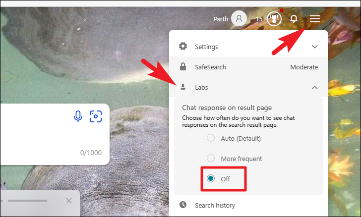 To turn off Bing Chat AI responses in Bing search, first, head to www.bing.com using your preferred browser and then click on the 'Hamburger' icon from the top right corner. After that, expand the 'Labs' section and then click on the 'Off' option. That's it. This would turn off responses from Bing Chat AI on the search result page while keeping Bing chatbot intact.