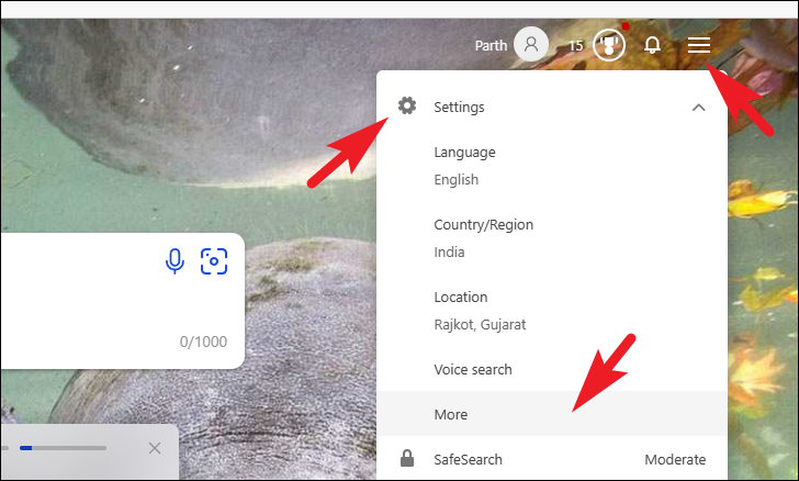 However, if you wish to remove the Bing Chat AI option altogether, you can do that too. Click on the 'Hamburger' icon and then choose the 'Settings' option to expand it. After that, click on the 'More' option.
