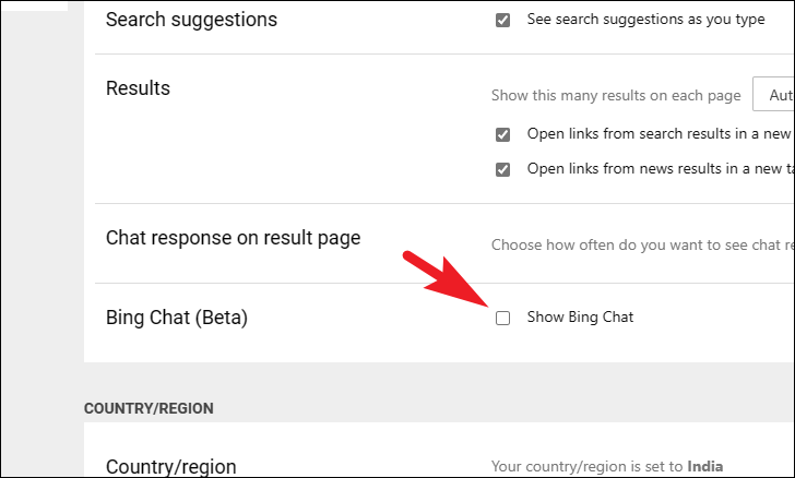 Then, scroll down and uncheck the 'Show Bing Chat' option on the page.