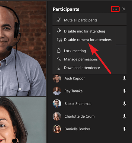 The participant panel will open on the right. Go to ‘More options’ (three-dot menu icon) at the top right of the panel and select ‘Disable camera for attendees’ from the menu that opens.